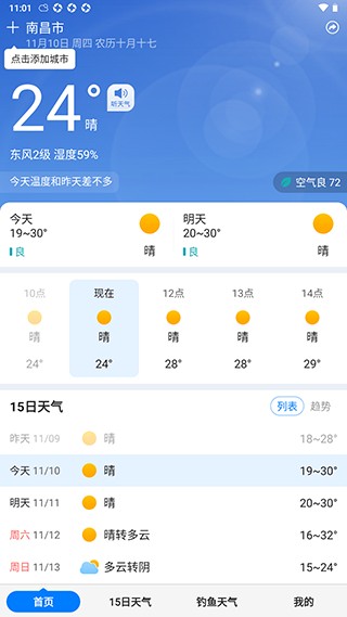 1、安装并打开软件,选择所在城市,即可查看实时天气预报。