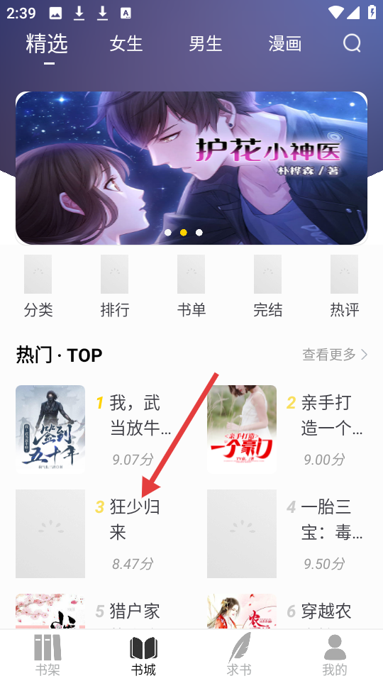 2、在书城的热门・TOP板块里,找到并点击【狂少归来】这个条目,就能进入到该书的详情页面了。